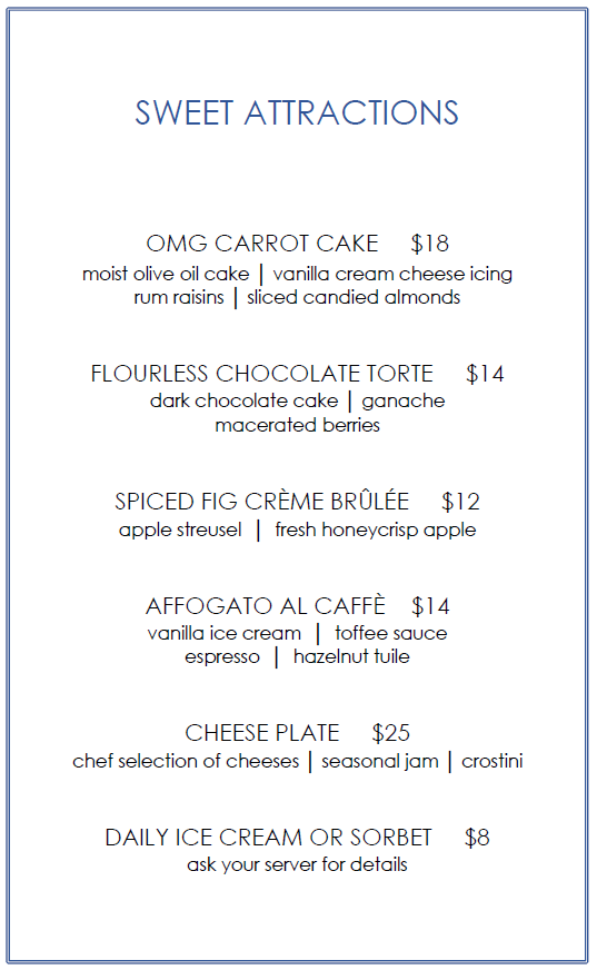 Finish your meal with one of our exquisite desserts. Pair it with a special digistif, 100 year port flight or one of our twelve assorted Madeira Vintages ranging from